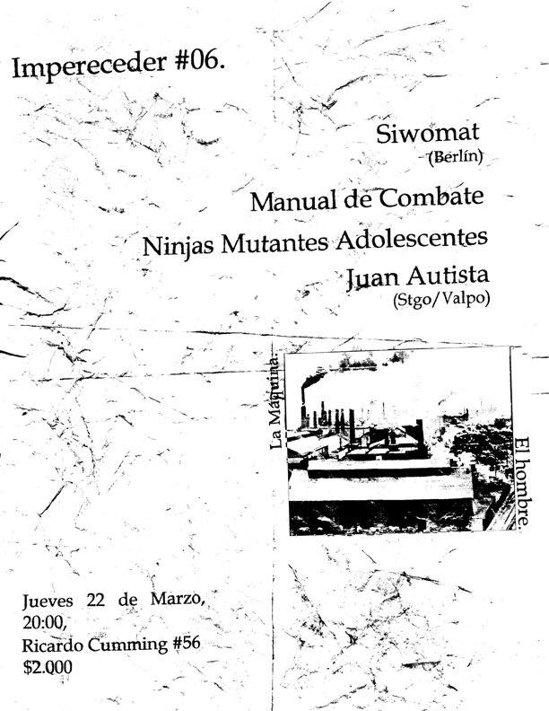 Manual de Combate, una de las bandas más activas de Santiago en el último tiempo y luego de su gira por Europa no para en las ansias de hacer cosas, discos, conciertos y etcéteras, en base a esto es que llega la sexta versión de Impereceder, en esta edición contará con la visita de Siwomat una banda de Berlín que canta en castellano, una linda oportunidad para conocer nuevos ruidos.